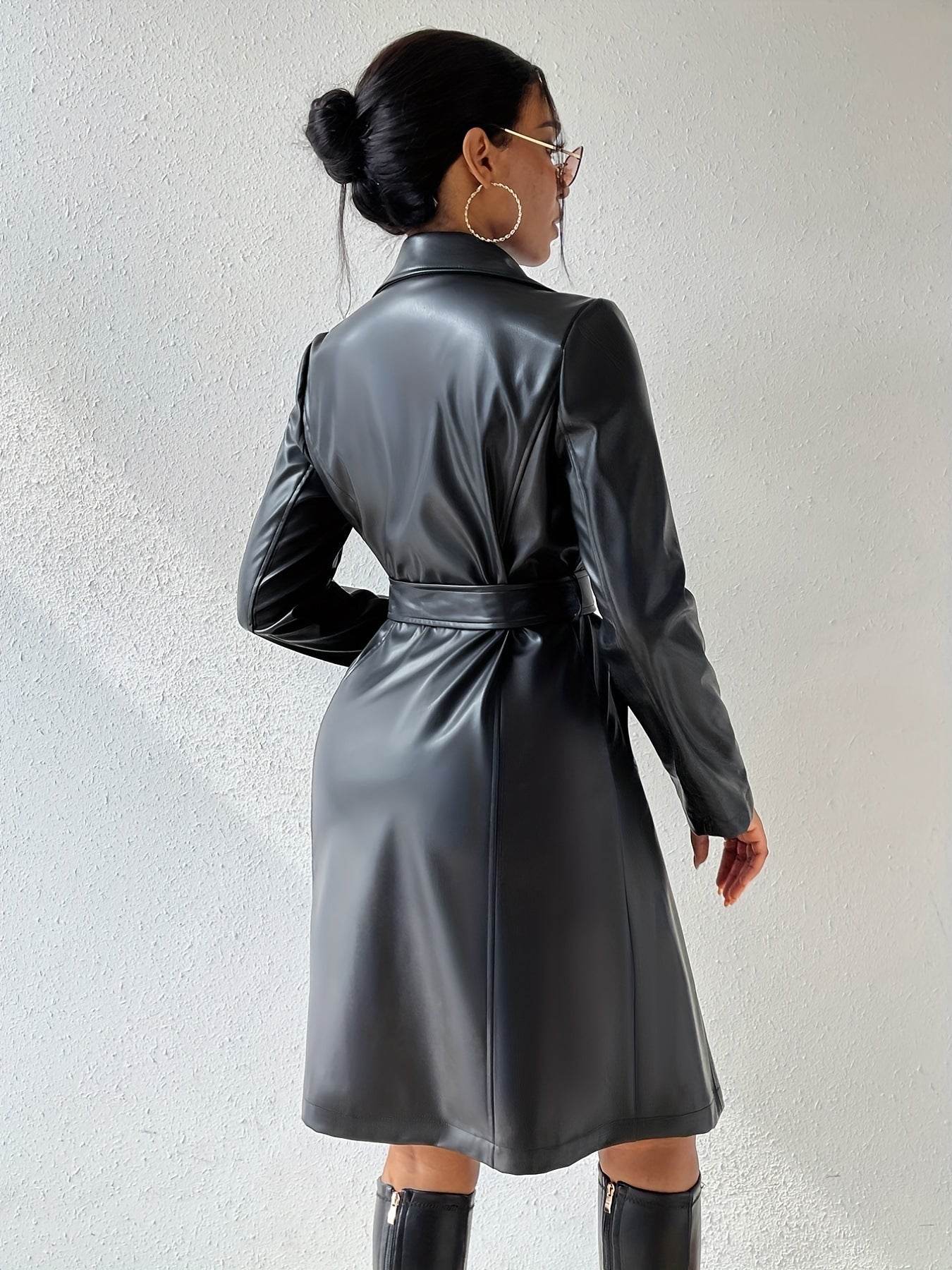 Découvrez l’élégance intemporelle avec ce manteau long en simili cuir, idéal pour affronter les journées fraîches avec style. Sa coupe slim et son col à revers apportent une touche chic et sophistiquée à votre look.